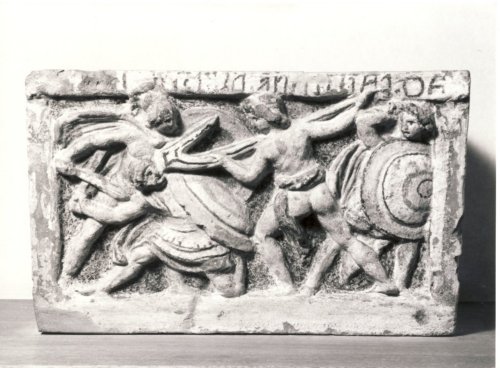- NOTIZIE STORICO CRITICHE L'urna, realizzata a stampo, proviene dalle officine di Chiusi, vista anche la materia prima utilizzata. Il motivo iconografico raffigura il mito di Echetlo, contadino che combatte nella battaglia di Maratona contro tre guerrieri, armato solo con un aratro. Questo tema, molto diffuso nel II secolo a.C., può essere collegato anche con il periodo delle lotte sociali del II secolo a.C. che si svolsero in Etruria. Ci sono state parecchie difficoltà nel riunire insieme le casse e i loro rispettivi coperchi. Infatti quest'urna nel Museum Veronense fu raffigurata da Maffei con un coperchio con la figura del defunto recumbente, con la testa appoggiata su alcuni cuscini, che non è stato mai trovato. Già nell'allestimento precedente, invece, l'urna fu esposta con un coperchio a lei non pertinente, ma da collegare con il n. inv. 28711. Questo errore fu commesso anche nella pubblicazione di Modonesi 1995, dove il n. inv. 28710 fu pubblicato con il coperchio errato. Quest'urna quindi si presenta priva di coperchio.