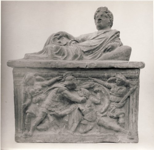 - NOTIZIE STORICO CRITICHE Quest'urna proviene dalle officine di Chiusi, vista anche la materia prima utilizzata. Il motivo iconografico è molto diffuso sulle urne di Chiusi nel periodo dalla seconda metà del II secolo a.C. all'inizio del I secolo d.C. Per motivi stilistici l'urna può essere collocata cronologicamente intorno alla seconda metà del II secolo a.C.