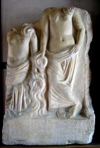 - NOTIZIE STORICO CRITICHE L'iscrizione è espressa in distici elegiaci. I caratteri epigrafici appaiono alquanto curati; epsilon, sigma e omega hanno forma lunata, il tratto destro dell'alpha e del lambda è prolungato in alto, il phi ha l'asta prolungata in basso e in alto. Presumibilmente si tratta di una dedica per la costruzione di un bagno o di una fontana da parte della Valentilla nominata nel primo verso. Maffei interpretò l'epigramma ritenendo si riferisse al rito del battesimo e lo credette cristiano; già Venturi e Duetschke riconobbero però nelle figure due ninfe. In due epigrammi ricordati dal Robert (Ant. Pal., IX, 607 e 609) viene menzionato il "loutròn" delle Cariti; nel secondo si accenna allo splendore delle membra ("aglaie") delle dee, conservato dall'acqua. Per le strette correlazioni tra questi epigrammi, relativi a governatori del basso impero in occasione della costruzione di acquedotti, bagni e fontane, ed il nostro pezzo, si ritiene esso debba essere incluso nella stessa categoria di composizioni commemorative. Grazie al manoscritto delle "Inscriptiones" di Giovanni Antonio Astori è certo che la stele, tra il 1685 e il 1704, si trovava a Venezia "in horto Nanio" a Cannaregio.