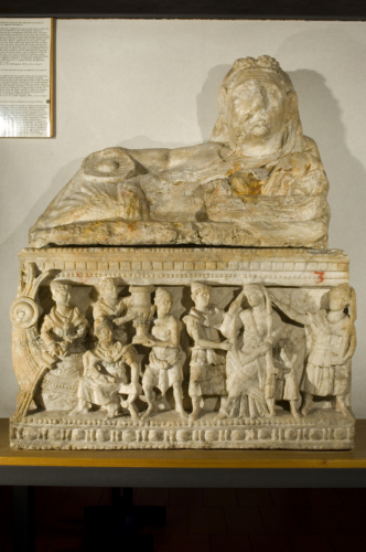 Coperchio: figura recumbente, velata, vestita con tunica e mantello; il braccio destro è disteso lungo il corpo e nella mano tiene una patera umbilicata e radiata; il braccio sinistro, piegato, poggia su un doppio cuscino; il volto è caratterizzato da grandi orecchie, capelli divisi in ciocche, sul capo due fiori. Cassa: parallelepipeda apoda, la cornice superiore è composta da fila di perline, listello, toro, dentelli, listello con fila di perline centrale; lo zoccolo è ad astragali tra due file di perline; sulla fronte, a rilevo è rappresentato a partire da sinistra la poppa di una nave, sulla quale una figura maschile con tunica, mantello e copricapo regge con entrambe le mani un lungo oggetto; segue un figura maschile vestita allo stesso modo seduta su uno sgabello, dietro altra figura simile, nell'atto di prendere o porgere un cratere rivolto verso un'altra figura a torso nudo; tutti volgono lo sguardo verso destra; segue una figura maschile vestita nel medesimo modo che sorregge una figura femminile vestita con tunica e mantello portato sul capo; dietro lei la figura di un bambino (acefalo); segue un figura maschile vestita similmente alle altre mentre sorregge la donna.