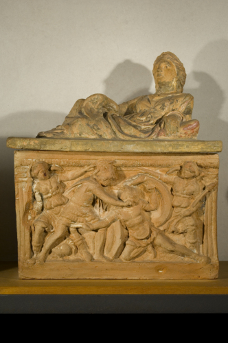 Coperchio: figura femminile recumbente con tunica e mantello che copre le gambe; il braccio destro è disteso lungo il corpo e la mano, che poggia sul ginocchio piegato, tiene un ventaglio; il braccio sinistro, piegato, poggia su un cuscino e la mano è ornata con un anello; il volto frontale ma leggermente spostato verso destra è coronato da un diadema, le ciocche dei capelli incise. Cassa: parallelepipeda apoda; zoccolo a listello, cornice a listello ed astragalo; lo spazio rappresentativo è inquadrato da due colonne scanalate, al centro due figure maschili in combattimento, quella di sinistra è rappresentata stante, vestita con corta tunica, affonda la lama nel collo dell' avversario e con l'altra mano ne tiene lo scudo, la figura di destra in ginocchio, vestita con corta tunica e armatura, affonda la lama nel ventre dell'avversario mentre con l'altra mano regge lo scudo a protezione delle spalle; ai lati delle due figure centrali due figure femminili alate che impugnano una fiaccola. All'interno dell'urna è conservati un sacchetto di ossa cremate.