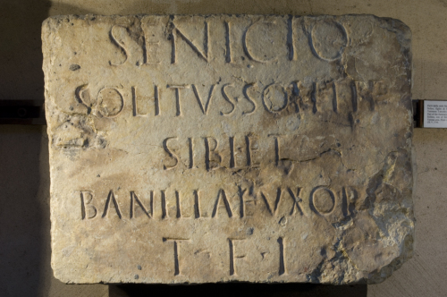 • ISCRIZIONI fronte - Senicio / Solitus, Soliti f(ilius), / sibi et / Banillae uxor[i]. / T(estamento) f(ieri) i(ussit). - Lettere posate maiuscole - Incisione - latino