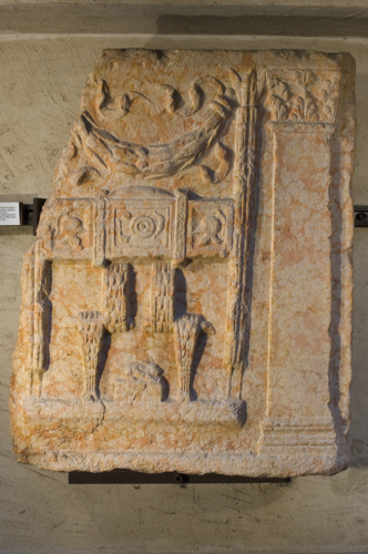 Lastra di forma parallelepipeda, con rilievo incorniciato da listello piatto. Sulla fornte è rappresentata una sella curule tra fasci littori; a destra è visibile un pilastrino con capitello.