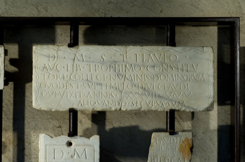 - ISCRIZIONI fronte - D(is) M(anibus) s(acrum) T(ito) Flavio / Aug(usti) lib(erto) Trophimo constitu/tori collegi(i) numinis dominorum / quod est sup(!) templo divi Claudi / qui vixit annis LXXXVII v(ixi!) u(t!) v(olui!) / aliquando securus sum. - Lettere posate maiuscole - Incisione - latino