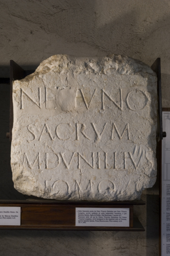 - ISCRIZIONI fronte - Nep[t]uno / sacrum. / M(arcus) Dunillius / Homo. - Lettere posate maiuscole - Incisione - latino
