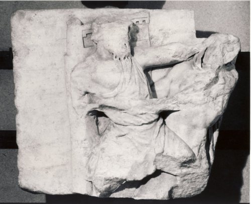 - NOTIZIE STORICO CRITICHE Su questo rilievo non ci sono precise informazioni sulla provenienza. E' in corso di preparazione uno studio da parte di A. M. Pastorino. Infatti alcuni studiosi, fra cui Ritti, avevano ipotizzato per questo pezzo una provenienza greca, ammettendo la presenza del berretto frigio sul capo dell'uomo con la barba e collegando quindi questa scena con le scene di Iliupersis, appartenenti generalmente a sarcofagi. Per motivi stilistici può essere datato intorno al II secolo d.C.
