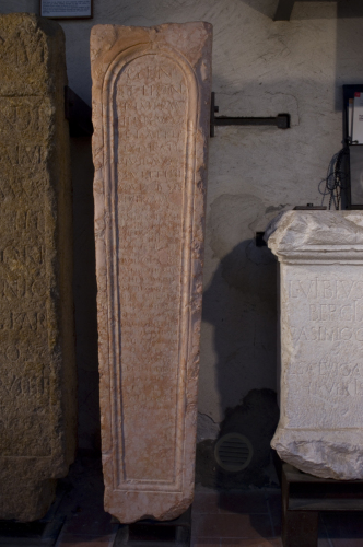 - ISCRIZIONI fronte - Gen(io) / et hon(ori) / Primi Pam/pili Secundi / et L(uci) Atili / Exorati / Vivir(orum) Aug(ustalium) et / M(arci) Vettidi / Aquilei[e]sis / Vivir(i) Aug(ustalis) / quinquen(alis) / et in omnib(us) coll(egiis) / magisterio per/functus d(atis) in tutel(am) / HS n(umis) M(arcus) [P]o[b(licius) A]rtemi/sius qui et [ - - -]asco / Ortensius Firmian(us) / Valerius Surian(us) et / Publilius Vitalis et / Aduacius Primian(us) / qui magister(io) eor(um) / offic(io) functi sunt / magistri s(upra) s(cripti) titu/lo honoris usi / datis in tutelam / HS n(umis) M / ut ex usur(is) eor(um) / quodann(is) die / III Id(us) April(es) per / officiales sa/crificetur et oleo et prop(inatione) / dedicaver(unt). - Lettere posate maiuscole - Incisione - latino