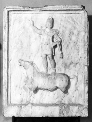 Lastra quadrangolare di marmo, corniciata da una modanatura a gola e listello solo sui due lati verticali e il lato superiore, allinterno della cornice un altorilievo di un giovane in piedi su cavallo rivolto a sinistra, mancano le due zampe sinistre; il giovane indossa un cappello frigio e pantaloni di tipo asiatico. Liscrizione occupa la fronte del lato inferiore della lastra, che privo di cornice, è tagliato in modo da creare il piano di calpestio alle due figure, secondo una tipologia tipica dei rilievi mitraici dolicheni.