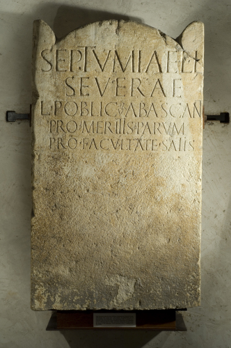 - ISCRIZIONI fronte - Septumiae, L(uci) l(ibertae), / Severae. / L(ucius) P(oblicius) Abascant(us). / Pro meritis parum, / pro facultate satis. - Lettere posate maiuscole - Incisione - latino