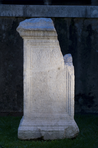 - ISCRIZIONI fronte - L(ucio) Ragonio L(uci) f(ilio) / Pap(iria) Urinatio / Larcio Quinti/ano co(n)s(uli), sodal(i) / Hadrianal(i), / leg(ato) / leg(ionis) XIIII gem(inae), donis / militarib(us) donat(o) / ab imp(eratore) [[C[ommodo]]] / Antonino Aug(usto), pro/co(n)s(uli) provinc(iae) Sard(iniae), / iurid(ico) per Apuliam, / praef(ecto) frum(enti) dand(i), / praetor(i), aedil(i), q(uaestori) / provinc(iae) Afric(ae), / sevir(o), / Chrysopaes, Euty/ches, [[[ - - - ]]] / servi / domino optim(o). - Lettere posate maiuscole - Incisione - latino