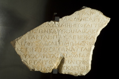 - NOTIZIE STORICO CRITICHE I caratteri epigrafici, quali i tratti esterni del sigma ancora divaricati, il terzo tratto del pi che non raggiunge completamente la base della lettera e l'omikron notevolmente rimpicciolito, consentono di attribuire il pezzo al medio ellenismo. Nonostante la frammentarietà del testo, vista la menzione di un personaggio, del padre e, probabilmente, dei suoi discendenti, sembra si tratti di un decreto onorario.