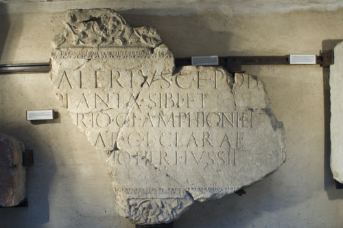 - ISCRIZIONI fronte - [C(aius)] Valerius, C(ai) f(ilius), Pob(lilia), / Planta, sibi et / [C(aio) Vale]rio, C(ai) l(iberto), Amphioni et / [Valeri]ae, C(ai) l(ibertae), Clarae. / [Testamen]to fieri iussit. - Lettere posate maiuscole - Incisione - latino