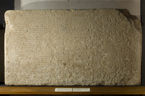 - ISCRIZIONI fronte - I: [Il tale, anche a nome]/ del fratello Dionysikles e della/ moglie Apphion, figlia di Lukios: 100/ Chares, figlio di Metrophanes, anche a nome del figlio Metrophanes/ figlio di Chares, figlio di Metrophanes: 100/ Eukles, figlio di Sostratos, anche a nome del padre/ Sostratos, figlio di Eukles: 100/ Sarapion, figlio di Sarapion, ma per natura di Pythion,/ anche a nome dei figli: 100/ Euares, figlio di Dionysios: 100/ Herakleides, figlio di Charidermos, figlio di Metrodoros/ anche a nome del figlio Glaukias, figlio di Herakleides,/ [figlio] di Simelos, e della moglie Hedeia,/ figlia di Glaukias: 100/ Kleitos, figlio di Poltys, figlio di Kleitos, anche a nome del/ fratello Menodotos, figlio di Poltys e/ del bambino di questi, Poltys: 100/ Metrobios, figlio di Phanes, anche a nome della moglie/ Demò, figlia di Bion, e a nome della madre/ Hedista, figlia di Heronikos: 200/ Aristeus, figlio di Eudomios, anche a nome dei figli/ Dionysios e Phideleos (?) e della moglie Theodote,/ figlia di Dionysos, ma per natura di Metrodoros: 200/ Menekles, figlio di Hermogenes, anche a nome del padre/ Hermogenes, figlio di Menekles, e del fratello/ Metrodoros, figlio di Hermogenes, figlio di Menekles: 100/ Lamprias, figlio di Neon, anche a nome del figlio Neon: 100/ Apollophanes, figlio di Hikesios, detto Protion,/ anche a nome dei fratelli Attalos, Hermogenes,/ Hikesios, figlio di Hikesios, figlio di Attalos, e a nome del padre/ Hikesios e della madre Metreis e della/ moglie Metrò, figlia di Menophilos: 100/ Attalos, figlio di Menophilos, anche a nome del figlio Menophilos/ e della figlia Melinne: 100/ Phanes, figlio di Apollonios, figlio di Phanes, anche a nome del/ fratello Menandros, figlio di Apollonios,/ e del padre [Apollonios,/ figlio di Phanes]: [100]/ [...]/ II: Apellikon, figlio di Menodotos, anche a nome del figlio/ Menodotos e della moglie Demò,/ figlia di Posidonios: 100/ Kallikrates, figlio di Apollonios, anche a nome della nutrice/ Laodike: 100/ Polykritos, figlio di Eugeitos, anche a nome del padre/ Eugeitos, figlio di Eugeitos, il giovane, e/ della madre Artemò, figlia di Leon/ e del fratello Leon figlio di Eugeiton: [100]/ Hephaistion, figlio di Eupolemos: [100]/ Athenokles, figlio di Menophilos, anche a nome del padre/ Menophilos, figlio di Athenokles: 100/ Herogeiton, figlio di Demetrios, anche a nome dei figli/ Demetrios e Herogeiton: 100/ Demetrios, figlio di Dionytas, figlio di Demetrios,/ anche a nome della madre [---]: 100/ Nikolaos, figlio di Demetrios, anche a nome dei figli/ Demetrios, Nikolaos e Theokritos: 100/ Apelles, figlio di Chares, figlio di Artemidoros: 100/ Dionysios, figlio di Zopyros, anche a nome del [---]/ e del fratello [---]: [100]/ Paionios, figlio di Paionios, anche a nome del fratello/ Artemidoros e della madre Megistò: 100/ Araton, figlio di Aristoxenos, figlio di Eubulos, anche a nome/ della moglie [---], figlia di Anaxibios,/ e dei figli [---]: [100]/ Metrodoros, figlio di Polemon, anche a nome del figlio Polemon [---]: (?)/ [---circa 9 righe---]/ III: Phanes, figlio di Apollonios [---]/ Dionysios, figlio di Eukleides [---]/ Klymenos [---] e [---]/ Apollonid[---]/ [---] e t[---]/, figlio di Aristos [---] e [---]/ Phanes, figlio di Antiphilos, anche a nome dei figli Dionysios e Antiphilos [---]/ Moschion, figlio di Moschion, detto/ Sarapion, anche a nome di [---]/ [--- 7 righe ---]/ Praxias, figlio di Herodotos, per natura di Apollonios, anche/ a nome della figlia Mosch[---]/ Antiphanes, figlio di Demas, anche a nome della madre [---]/ Herkleides, figlio di Dionysios, figlio di Herakleides,/ figlio di [---], anche a nome del figlio Herakleides,/ figlio di Herakleides, il vecchio: 50/ [---]ios, figlio di Lysanias, anche a nome della moglie/ Stratonike [---]: 50/ Paramon, figlio di Heromgenes, anche a nome della madre/ [---]phile e della moglie [---]/ Hermagoras, figlio di Artemon, anche a nome dei figli/ [---circa 8 righe---] - Incisione - greco