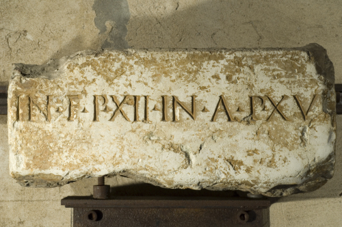 - ISCRIZIONI fronte - In f(ronte) p(edes) XII, in a(gro) p(edes) XV. - Lettere posate maiuscole - Incisione - latino