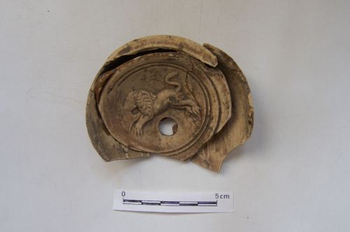 serbatoio troncoconico rovesciato, spalla leggermente inclinata verso l'interno, disco concavo decorato da leone con folta criniera che corre verso sinistra, co coda e zampe alzate.