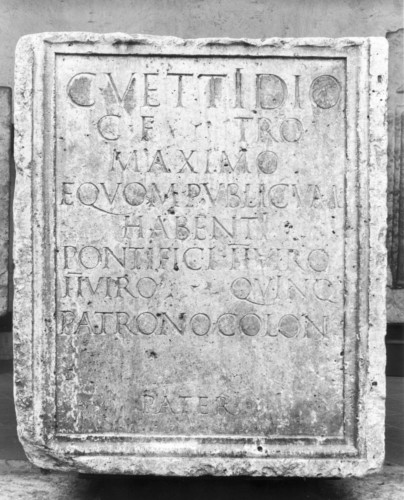 - ISCRIZIONI fronte - C(aio) Vettidio, / C(ai) f(ilio), Tro(mentina), / Maximo, / equom publicum / habenti, / pontifici, (duo)viro, / (duo)viro quinqu(ennali), / patrono colon(iae). / Pater. - Lettere posate maiuscole - Incisione - latino