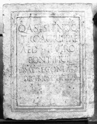 - ISCRIZIONI fronte - Q(uinto) Asisieno, Q(uinti) f(ilio), / Tro(mentina), Agrippae, / aed(ili), duoviro, / pontifici, / ex aere aere conlato. / Decuriones et pleps (!) - Lettere posate maiuscole - Incisione - latino