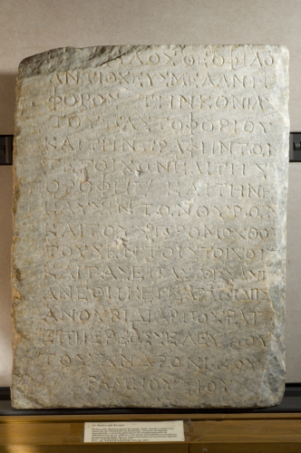 - ISCRIZIONI fronte - Theophilos, figlio di Theophilos di Antiochia, melaneforo, dedicò a Serapide, Iside, Anubide e Arpocrate l'imbiancatura del pastoforio e la decorazione pittorica dei muri e del soffitto e la pittura encaustica della porta e le estremità sporgenti delle travi che si trovano nei muri e i pannelli lignei sopra di essi, durante il sacerdozio di Seleukos, figlio di Andronikos - Incisione - greco
