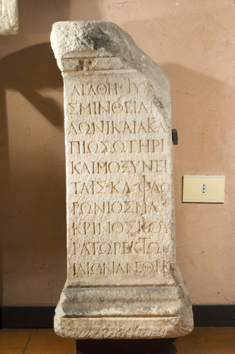 - ISCRIZIONI fronte, sullo specchio della base - Alla Buona Fortuna. Ad Apollo Sminteo e ad Asclepio Soter ed ai Mossiniti, Claudios Floronios Macrinos, curator, dedicò a proprie spese - Incisione - greco