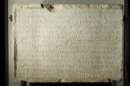 - ISCRIZIONI fronte - Aurelia Tryphaina, figlia di Alexandros, fece costruire/ l'heroon familiare (lett. ancestrale) per sé e per i propri eredi/ e liberti, e per Antonios Melitinos con/ la moglie Homoia e i loro figli, e/ il solo Pamphylos; avendo acquistato il nuovo sarcofago di marmo/ proconnesio, quello posto sotto (?) il solario. Nessun altro/ è autorizzato ad essere sepolto nel nuovo sarcofago,/ eccetto la sola Tryphaina; ugualmente (nessuno lo può)/ nell'altro sarcofago ancestrale, né è autorizzato ad alienare/ l'heroon. Se qualcuno oserà contravvenire a queste disposizioni,/ pagherà alla Madre degli dèi Sipilene/ 2.500 denari. La copia di questa iscrizione/ è depositata nell'archivio; registrata/ mentre Aelios Bion era stefaneforo, nel terzo mese - Incisione - greco