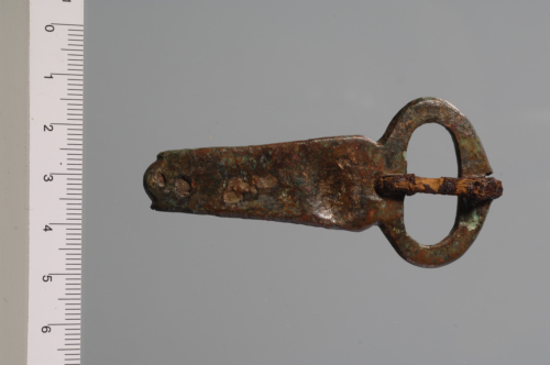 Fibbia a placca fissa allungata e rastremata, con estremità arrotondata e sagomata; anello ovale con espansione in corrispondenza della battuta dellardiglione, a punta ricurva per la quale è presente un incavo; sul lato opposto dellanello un foro permette larticolazione dellardiglione, a sezione quadrangolare. La superficie anteriore è liscia, i margini arrotondati; sul retro, piatto, sono presenti due maglie forate per il fissaggio alla cintura.