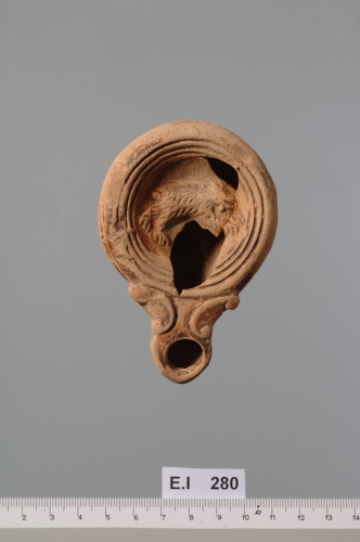 lucerna con serbatoio troncoconico rovescio, spalla leggermente inclinata verso linterno, solcata da tre circonferenze concentriche e tre cordoli digradanti (IIIa).Il disco concavo è decorato da un cane in corsa verso destra e presenta un infundibulum centrale di cui rimane solo una parte. Il becco ad ogiva e volute doppie ha il foro di bruciatura decentrato. La base piatta è limitata da una circonferenza incisa. Corpo ceramico rosato; vernice rosso bruna.