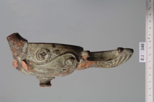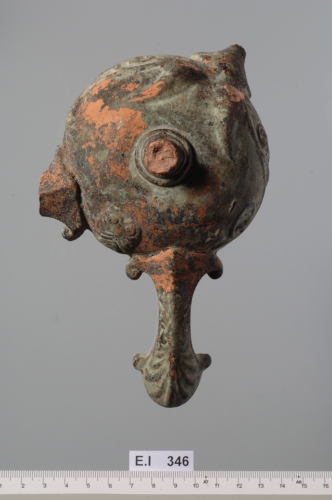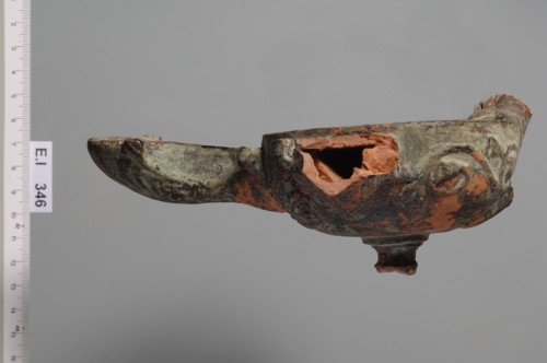 lucerna bicline su piede sagomato nella parte superiore, con vasca globulare decorata da delicati racemi vegetali terminanti in fiori di loto e campanelle e disco piatto con infundibulum centrale circondato da sette circonferenze concentriche in rilievo. L'ansa è spezzata all'attacco decorato da una palmetta in rilievo. Uno dei due becchi, con terminazione cuoriforme presenta una doppia voluta fortemente plastica ed è decorato nella parte superiore da una palmetta in rilievo e in quella inferiore da una palmetta che nasce da un fiore, motivo che in dimensioni ridotte si ripete sul serbatoio tra i due becchi; del secondo becco rimane solo l'attacco al serbatoio. Corpo ceramico arancio chiaro rosato ricoperto da una patina verdastra.