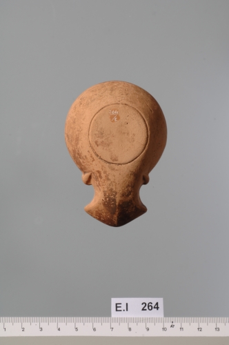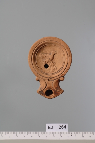 lucerna a serbatoio troncoconico rovescio con una spalla percorsa da tre cordoli digradanti verso l'interno e da tre circonferenze (II-IIIA). Il disco, leggermente concavo, è decorato da un rapace che ha tra gli artigli un'oinochoe bacellata. A sinistra degli artigli del volatile è ricavato l'infundibulum. All'inizio del becco è presente un piccolissimo foro di sfiato. La base piatta è delimitata da una circonferenza incisa. Corpo ceramico arancio chiaro tendente al nocciola; tracce di vernice bruno scuro opaca.