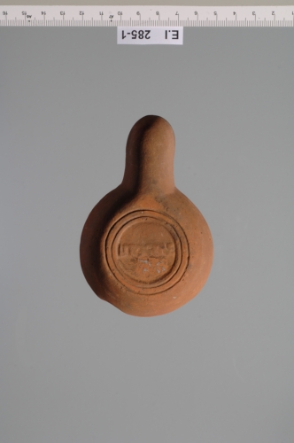 l?esemplare presenta una spalla estroflessa ornata da due borchiette piramidali, un disco liscio e ribassato con infundibulum centrale e un forellino di sfiato ricavato a metà circa del canale. La base, con tre anelli concentrici impressi, reca il marchio di fabbrica LITOGENE di difficile lettura forse anche per la matrice stanca.Corpo ceramico depurato arancio ingobbiato.