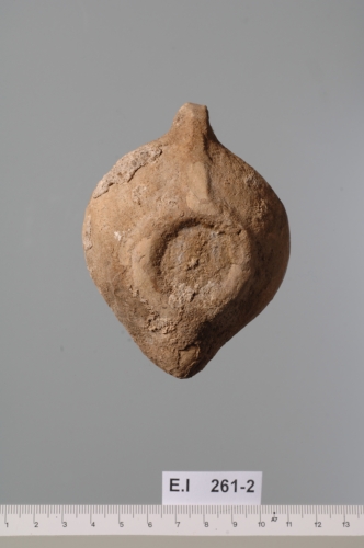 La spalla, estroflessa, è ornata da quattro file di perline rilevate e mal sagomate; il disco piccolo e lievemente concavo, è delimitato da un anello in rilievo e reca un grande infundibulum leggermente in asse con la presa e il foro di bruciatura. La presa, non distinta nettamente dal corpo, è forata ed è opposta al grande becco completamente occupato dal foro di bruciatura. La base, delimitata da un anello a rilievo, si collega alla presa con una nervatura. Corpo ceramico depurato di colore nocciola chiaro con tracce di ingubbiatura