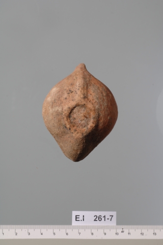 La spalla estroflessa è ornata da quattro file di perline rilevate e mal sagomate; il disco piccolo e lievemente concavo, è delimitato da un anello in rilievo e reca un grande infundibulum centrale. L?ansa forata probabilmente costolata è opposta al grande becco completamente occupato dal foro di bruciatura intorno a cui si nota un'area di riduzione di colore nerastro. La base, piatta, è racchiusa da un cordolo che continua con una nervatura fino all?ansa.Corpo ceramico depurato di color arancio rosato con tracce di vernice rosso bruna opaca.