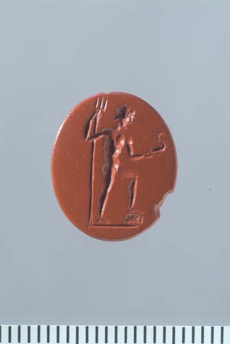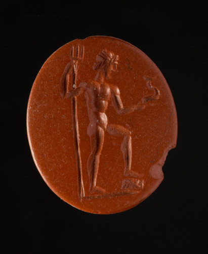 In un diaspro rosso di forma ovale è inciso Nettuno barbato, nudo, stante sulla linea del suolo, con il busto di tre quarti, le gambe e la testa di profilo verso des. La gamba sinistra, piegata ad angolo retto, poggia su un masso di forma rettangolare (in molte altre gemme il supporto è costituito invece da una prua di nave). Nella mano sin. rivolta in avanti regge un delfino con la coda ad esse sollevata, mentre con la des.impugna il tridente puntato al suolo, con le punte rivolte verso l'alto.