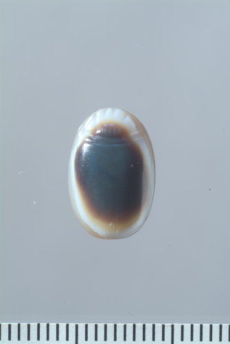 Scarabeo in agata zonata, con intaglio sul lato piano. Dello scarabeo sono indicati solamente il capo e le elitre. Sulla faccia inferiore, nel campo di incisione delimitato da un solco, è raffigurato un uccello retrospiciente(pavone?), di profilo verso destra. La piccola testa è resa con un globulo, così come i dettagli delle zampe, mentre le ali sono ottenute con solchi paralleli