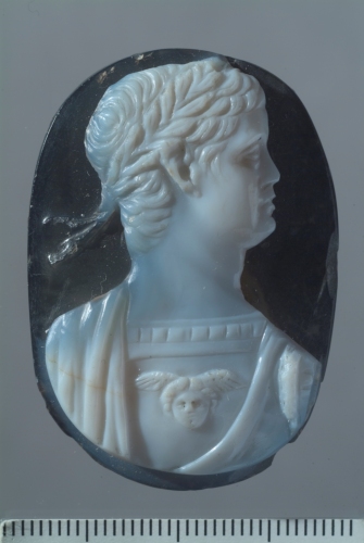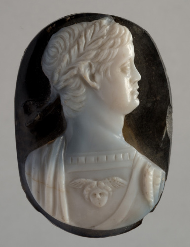 - NOTIZIE STORICO CRITICHE Il cammeo viene attribuito alla collezione Verdara da Nardelli 1999, p. 74 (che lo riconosce nell'Inventario, n. 19); mentre secondo Ravagnan 1997, p. 241, si tratta di uno dei pezzi conservati nello scrigno della Sala del Consiglio dei Dieci. Anche sull'identificazione del personaggio sono state formulate diverse ipotesi: Nardelli 1999, p. 74, pensa si tratti del giovane Caracalla, mentre Ravagnan 1997, p. 241, propone Augusto.