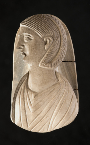 Il cammeo raffigura un busto femminile di profilo verso sin., tagliato al di sotto delle spalle, che si distacca notevolmente dal fondo. Da notare l'acconciatura, che lascia scoperto l'orecchio, caratterizzata da una treccia piatta, caratterizzata da una sorta di reticolato, fissata alla sommità della testa, mentre i capelli sul capo sono resi tramite solchi paralleli. Attorno al lungo collo si dispongono le pieghe della veste, caratterizzate da solchi paralleli che convergono verso il centro.