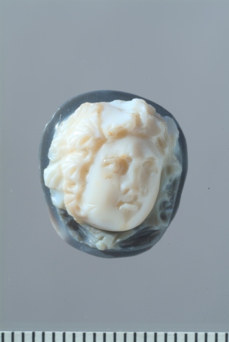 Nello strato bianco opaco della pietra è raffigurata la testa di Medusa, rappresentata di tre-quarti verso destra: il viso largo è caratterizzato dagli occhi infossati sotto le arcate sopraccigliari fortemente accentuate, dal naso largo e dalla bocca piccola. Fortemente plastica la capigliatura, disposta in ciocche disordinate; un ricciolo è inciso sulla guancia destra. Sotto il mento si intuiscono i due serpenti annodati.