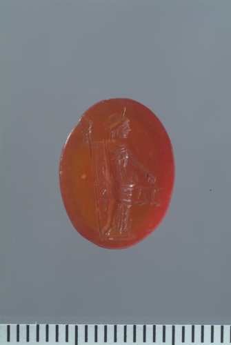 Su una corniola ovale è raffigurata Aequitas, stante su breve linea del suolo,di prospetto,con la testa diademata di profilo verso destra. Indossa un lungo chitone ed un mantello che le serra i fianchi e un cui lembo scende dalla spalla destra. Con il braccio destro, piegato ad angolo retto, si appoggia a una lunga asta o scettro puntato al suolo, mentre con la mano sinistra abbassata regge la bilancia.