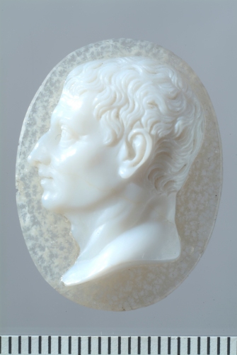 Nello strato superiore bianco opaco della pietra è raffigurato un busto maschile, di profilo verso sinistra, tagliato alla base del collo. Il profilo è caratterizzato dal naso leggermente aquilino e dall'occhio ben disegnato, dalla palpebra segnata, con la pupilla incisa. Due rughe sono segnate sulla fronte. I capelli corti, che lasciano scoperto l'orecchio, sono resi a ciocche sinuose.