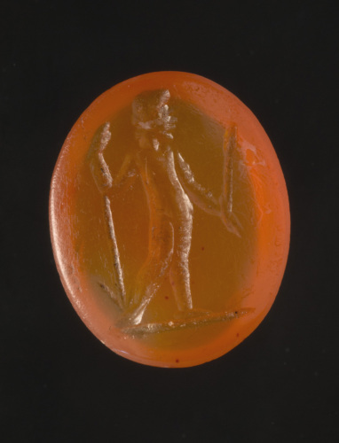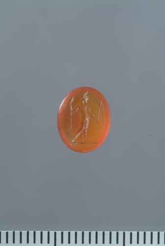 In una corniola ovale di piccole dimensioni è raffigurato un personaggio maschile nudo, stante sulla linea del suolo,di prospetto con la testa di profilo verso destra. Con il braccio destro piegato e sollevato si appoggia alla lancia puntata al suolo (da notare la punta dell'arma), mentre nella mano sin. tiene un attributo di forma allungata, che potrebbe essere interpretato come una spada (o una fiaccola). La figura può essere interpretata come un guerriero. I tratti del volto sono indistinti; il corpo, dall'andamento sinuoso, manca di partizioni interne; mani e piedi sono appena abbozzati.