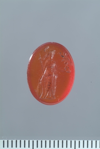 In una corniola ovale è raffigurata Atena Minerva stante di prospetto, con la testa di profilo verso destra. La dea indossa un lungo peplo, sotto le cui pieghe risalta la gamba destra lievemente flessa, mentre il peso poggia sulla sinistra; sulla testa porta un elmo crestato; col braccio destro allungato verso il basso sostiene lo scudo ovale poggiato sulla linea del suolo; dietro il braccio la lancia obliqua con la punta in alto; nella mano sinistra tesa in avanti regge una statuina Vittoria alata, armata di lancia e con una corona levata verso l'alto. L'intaglio, che riprende lo schema dell'Atena Parthenos, è accurato, anche se si tratta di una raffigurazione di serie