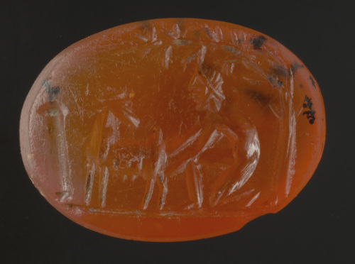Su una corniola ovale è disposta, in senso orizzontale, una scena di mungitura su una lunga linea del suolo. A sinistra un contadino barbato, di profilo verso destra, è curvo in avanti e inginocchiato, con il ginocchio sinistro poggiato al suolo; entrambe le braccia sono allungate in avanti per mungere una capra retrospiciente, anch'essa rappresentata di profilo. La scena è chiusa a destra da un albero fogliato, che si curva seguendo il margine della pietra, e a sinistra da una colonnina.