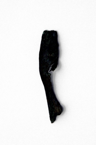 frammento di lamina di bronzo, probabilmente pertinente alla parete di una situla (l'attribuzione resta incerta a causa della limitata consistenza del frammento). Orlo diritto con labbro leggermente ispessito, sottolineato da una linea orizzontale debolmente incisa.