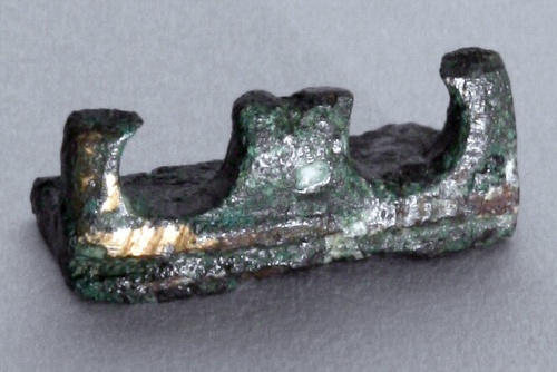 sostegno per vaso con larga base piana a profilo curvilineo; presenta una parete verticale lavorata a giorno, decorata lungo il margine inferiore da un filo di rame inserito ad agemina.