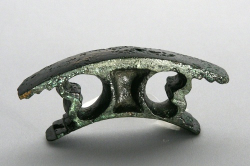 manufatto di forma curvilinea, lavorato a giorno, con bordi spessi e arrotondati, quello superiore munito di dentellature all'interno.