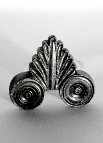 applique conformata a palmetta; sulla faccia interna presenta uno scanso profondo e alle estremità, in coincidenza con i dischi laterali, due fori circolari per lalloggiamento di perni di fissaggio. Probabilmente utilizzata per decorare un oggetto di arredo.