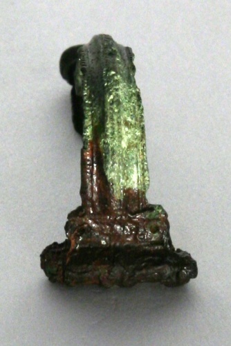 fibula a cerniera tipo Aucissa; arco a tutto sesto in fettuccia rastremata verso la staffa, con costolatura centrale decorata a falsa cordicella, affiancata da scanalature laterali terminanti in sottili costolature anch'esse decorate a cordicella. Alla testa dellarco, espansione a placchetta rettangolare decorata a occhi di dado e cerniera bilaterale arrotolata verso l'esterno, con terminazioni a pomello. L'ardiglione doveva essere in ferro, poiché restano tracce di ossido di ferro sulla cerniera. Allo stacco tra arco e staffa, due costolature trasversali; breve staffa a sagoma triangolare con dorso appiattito e sezione a T e pomello terminale profilato alla base da una costolatura.