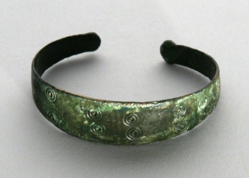 armilla in fettuccia di bronzo rastremata alle estremità, con capi aperti desinenti a globetto. Sul dorso decorazione incisa: dalla fascia centrale linee debolmente incise a separare coppie di occhi di dado impressi a bulino, motivi a spina di pesce, cerchi concentrici raccordati da linee longitudinali.