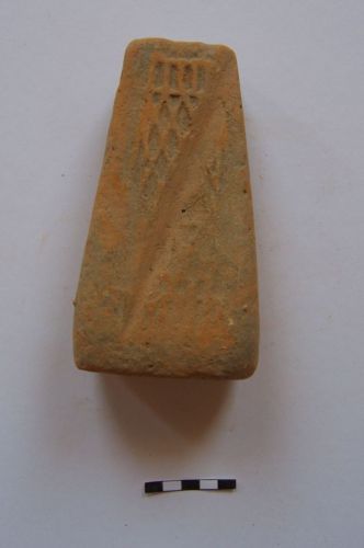 peso da telaio troncopiramidale, con foro pervio sulla sommità, con faccia anteriore decorata da motivo geometrico a canestro; l'intera superficie è attraversata da una fenditura forse intenzionale