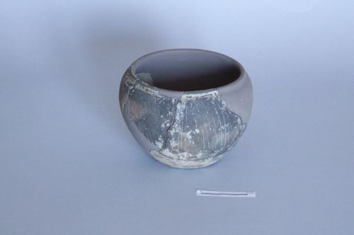 corpo globulare schiacciato, fondo piano, orlo sottolineato da una solcatura; parete esterna segnata da una serie di linee graffite intersecantesi a formare un motivo a graticcio
