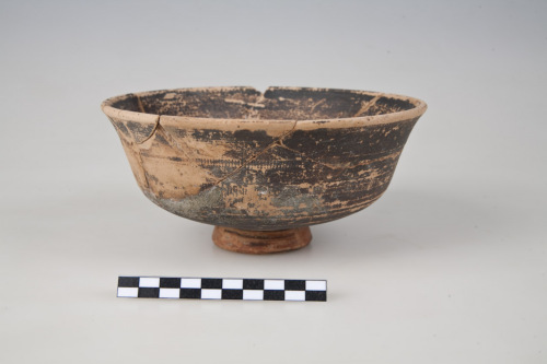 Coppa con orlo arrotondato, vasca con parete superiore a profilo sinuoso e carena arrotondata nella parte inferiore, piede ad anello troncoconico con profilo arrotondato. Sulla zona centrale della parete esterna, tracce di decorazione a rotella: due fasce orizzontali e parallele di tratti obliqui verso s. In prossimità della decorazione, segno di impronta digitale. Al di sotto della carena, due cerchi concentrici incisi. Umbelico di tornitura all'interno della vasca, al centro, e più pronunciato sul fondo esterno del piede. L'argilla è di colore beige-arancio, la vernice è bruna molto diluita, numerose macchie rossastre sulla superficie. Tracce di impronte digitali (vernice risparmiata per l'applicazione delle dita) sul collo del piede e sul piede.